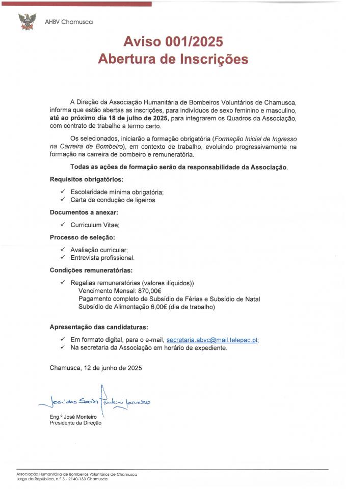 Aviso 001/2025- Associação Humanitária de Bombeiros Voluntários de Chamusca